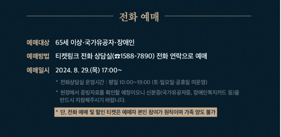 65세이상, 국가유공자, 장애인을 대상으로 전화예매가 가능합니다.